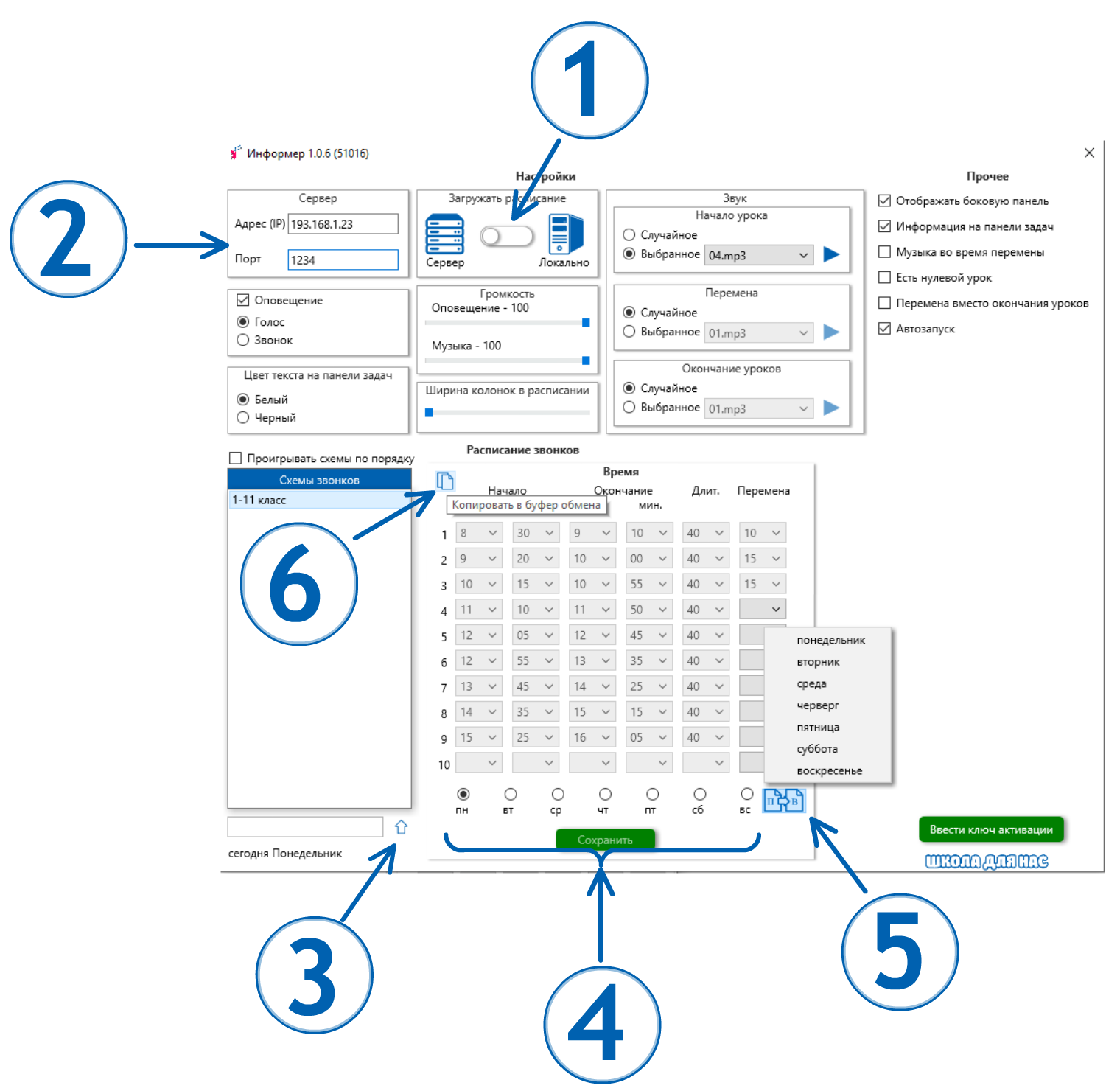 копирует текущее расписание звонков в буфер обмена, для последующей вставки его, скажем, в Word. В режиме Локально легко составлять расписание звонков, по мере необходимости, для распечатывания.
