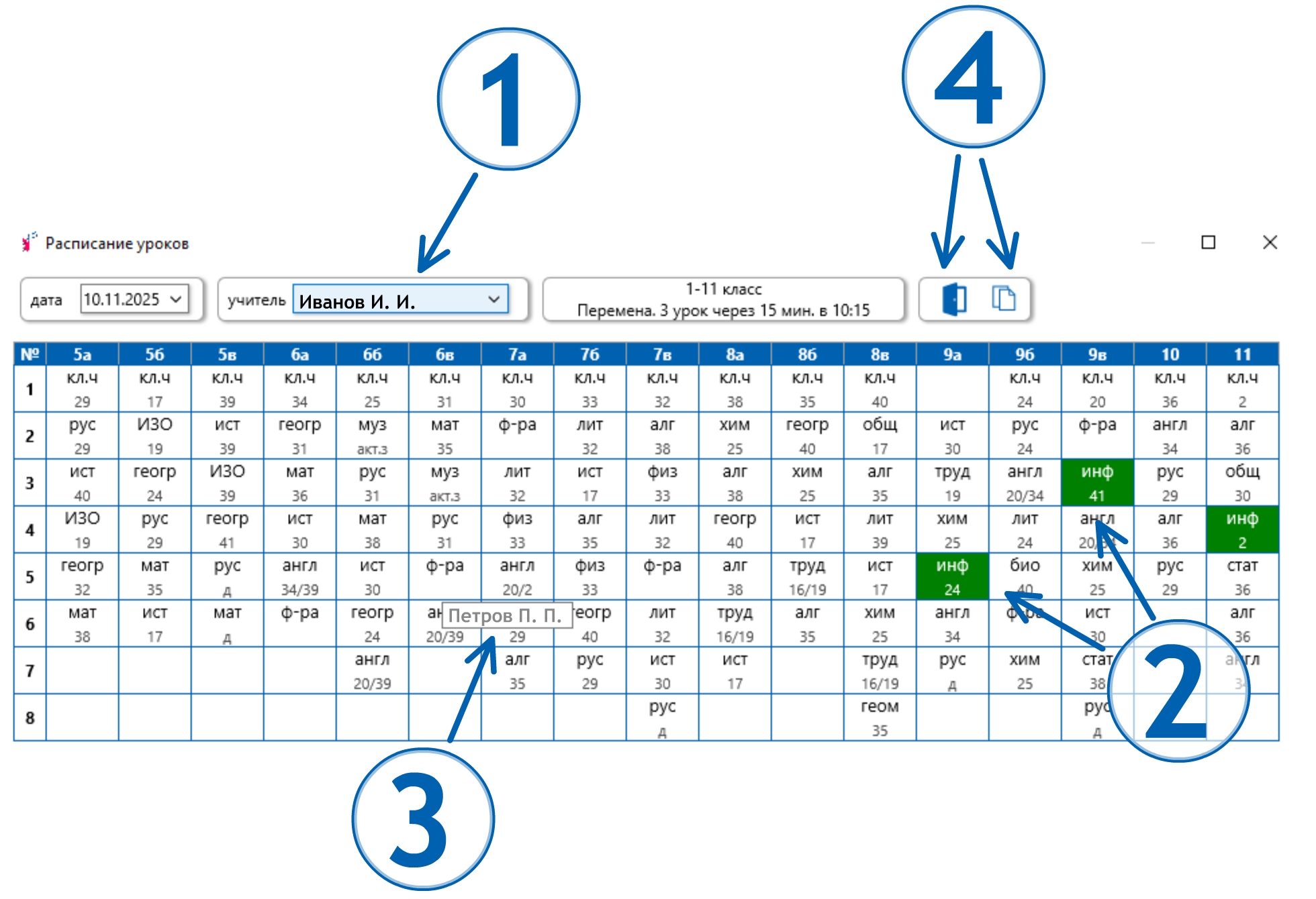 Установив Информер на рабочие компьютера учителей в кабинетах, каждый учитель сможет просматривать актуальное расписание с рабочего места. В списке можно выбрать конкретного учителя и узнать